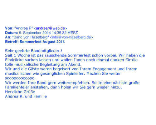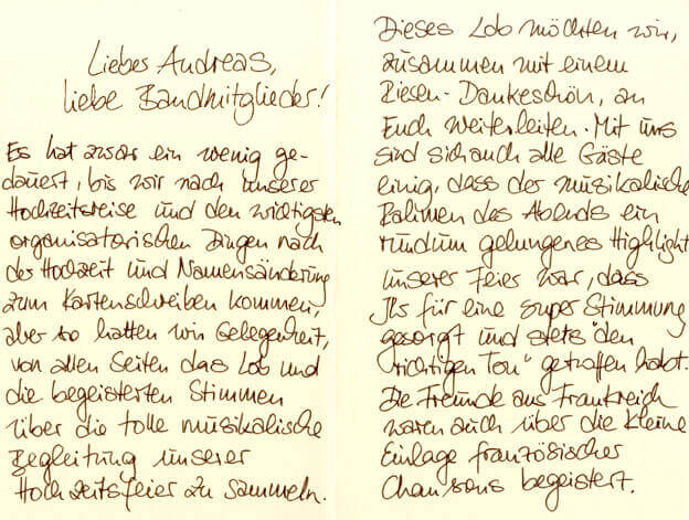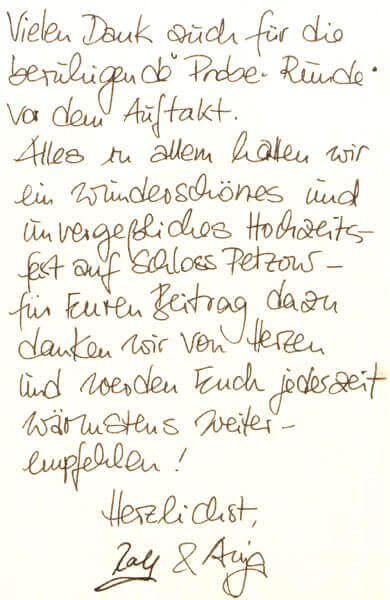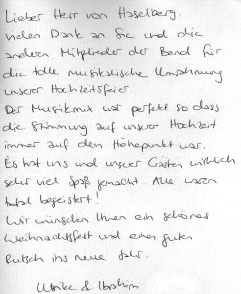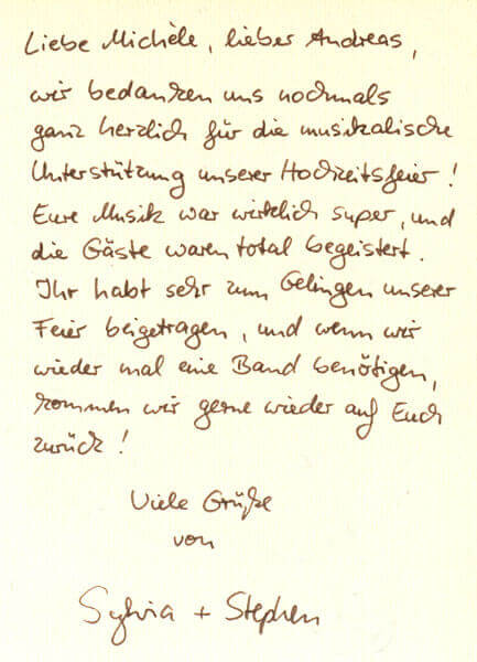 Wir stehen dem Brautpaar als Hochzeitsband mit langjähriger Erfahrung schon im Vorfeld mit Rat und Tat zur Seite. Gern erfüllen wir auch „außergewöhnliche“ Wünsche und freuen uns auf Ihren Anruf oder Ihre E‑Mail!