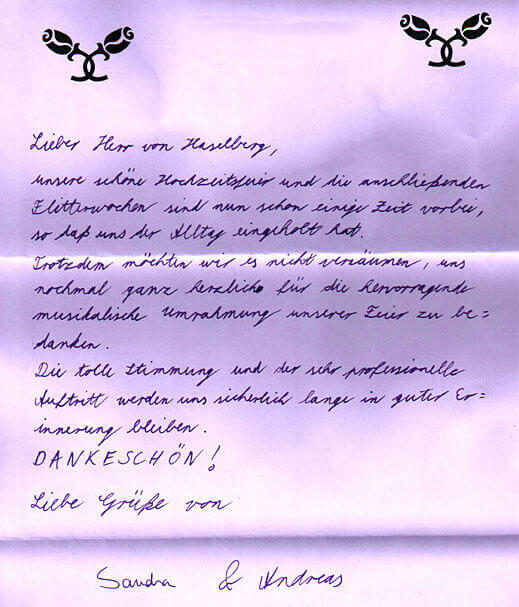 Die meist gebuchten Formationen auf Hochzeiten sind das Trio oder Quintett, jeweils mit Sängerin. In Kombination mit einer mobilen Discothek „on board“ erfüllen wir auch außergewöhnlichste Wünsche nahtlos in den kurzen Live-Pausen.